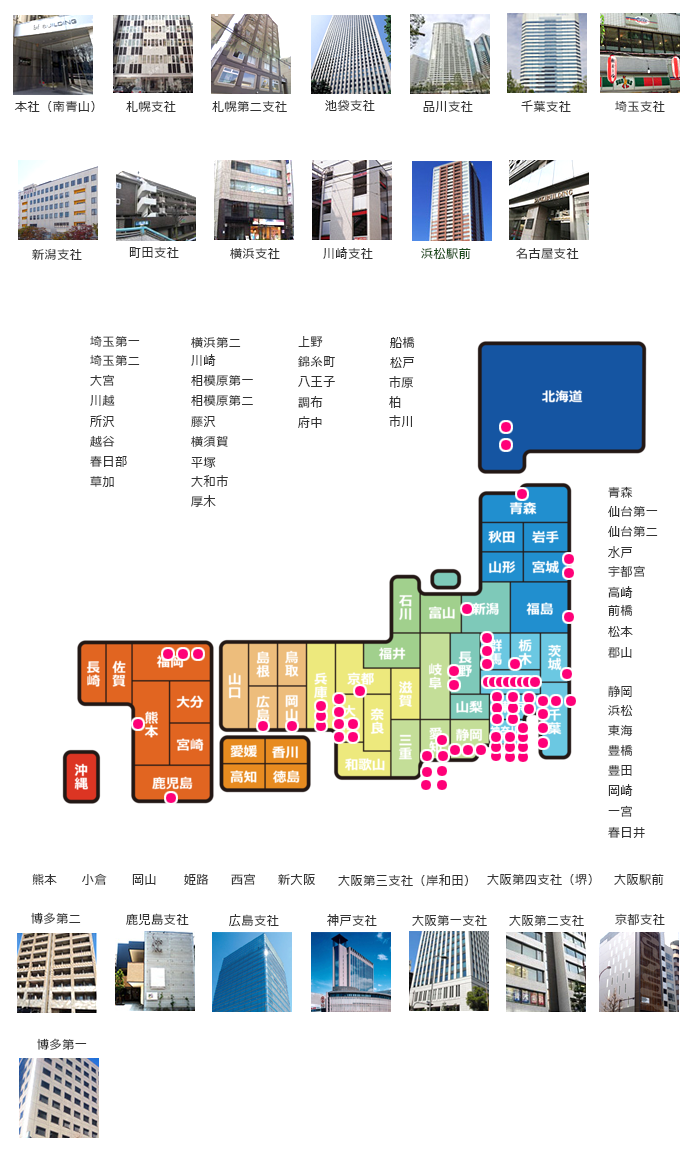 本社│札幌│札幌第二│ 青森│仙台第一│仙台第二│新潟│水戸│池袋│品川│上野│錦糸町│八王子│町田│調布│府中│千葉│船橋│松戸│柏│市川│市原│神奈川│横浜第一│横浜第二│川崎│相模原第一│相模原第二│藤沢│横須賀│平塚│長野│大和│厚木│埼玉第一│埼玉第二(さいたま)│大宮│川越│所沢│越谷│春日部│草加│宇都宮│高崎│前橋│松本│郡山│静岡│浜松│浜松駅前│名古屋│東海│豊橋│豊田│岡崎│一宮│春日井│京都│新大阪│大阪第一(本町)│大阪第二(吹田)│大阪第三(岸和田)│大阪第四(堺)│大阪駅前│神戸│西宮│姫路│岡山│広島│博多第一支社│博多第二支社│小倉│熊本│鹿児島